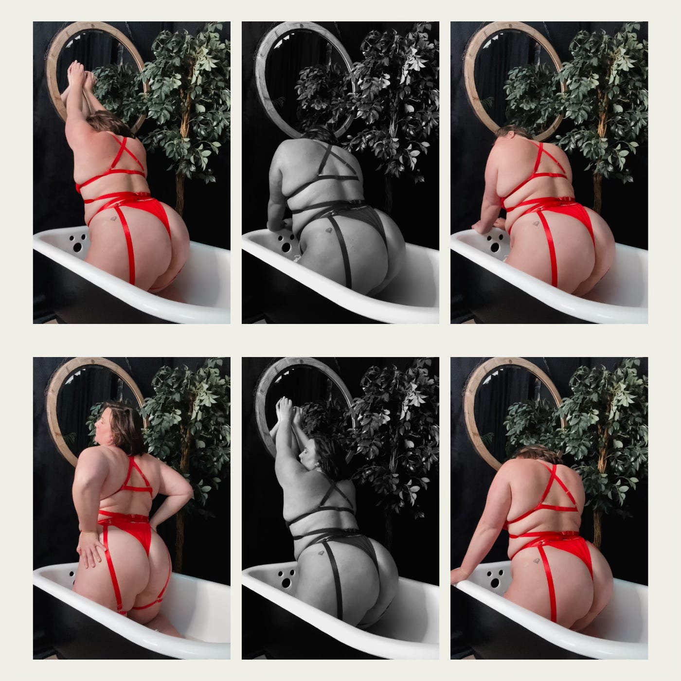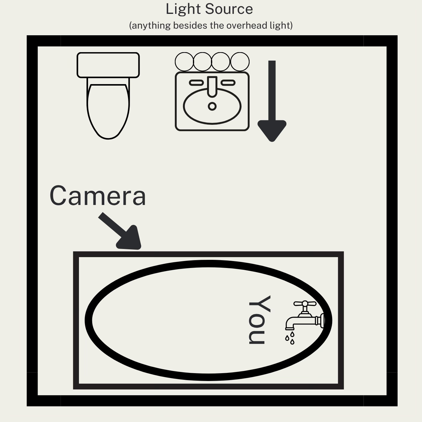 Step 1: You need a tub for this one, which makes this pose a little niche. There are so many cute poses you can do in a tub, but for the sake of being the most inclusive, you will be kneeling in the tub for this one. Place yourself in the tub, on your knees, facing the water faucet. Ideally, you want directional light on this one, so your best bet is to turn off the overhead light and turn on the lights above the sink. You want your phone to be facing your backside, so situate it as best you can in your small space to see the back of your body.